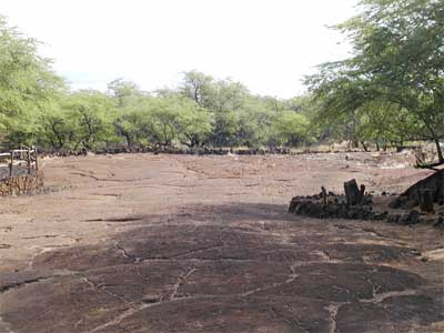 ![]() At one point, all of Hawaii was lava. Some of it still shows, but there was also water, and the kiawe. These trees are among the first to colonize the bare stone, growing from cracks and crevasses. They break the rock into stones and then into soil. The petroglyph tail leads through this forest of spooky, twisted trees. |