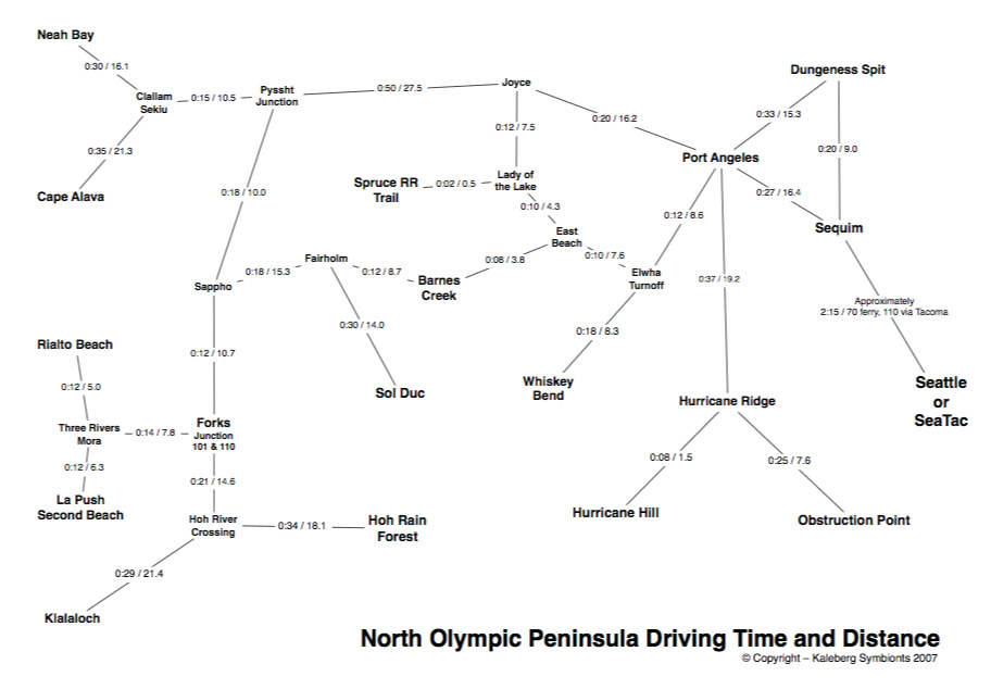 Here is our driving time and distance map for the North Olympic Peninsula. The distances are generally from Google Maps, but the driving times are based on our own experiences in the area. (Google Maps has some weird ideas of how fast one can go on certain roads). This map mentions a number of locations that do not appear on any other map, such as Elwha Turnoff and Hoh River Crossing. These locations are generally at junctions near the landmark, junction or town indicated.