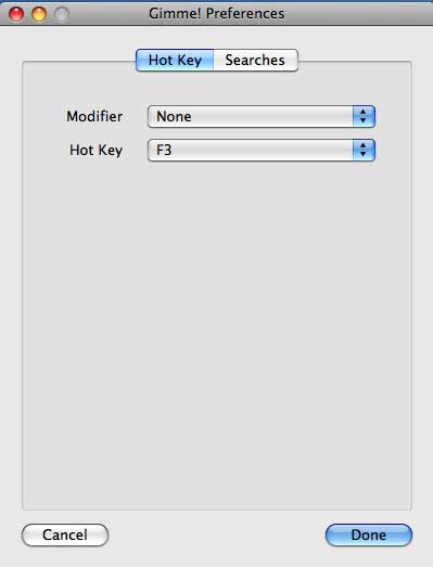 When the Gimme! main window is visible, you can get to the preferences by using the Gimme! > Preferences menu item, or you can use Command-comma. There are two panes in the preferences window. One lets you choose which function key and modifiers will bring up Gimme! if you don't like using F3.